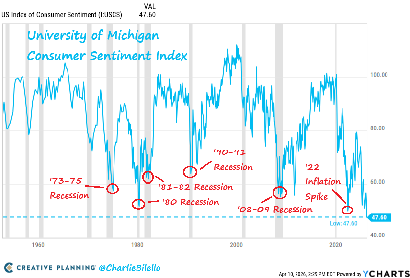 And behind all of it, consumer psychology has broken: year-ahead inflation expectations surged from 3.8% in March to 4.8% in April, the largest one-month increase since April 2025. The University of Michigan Consumer Sentiment Index plummeted to a historic low of 47.6 in early April.