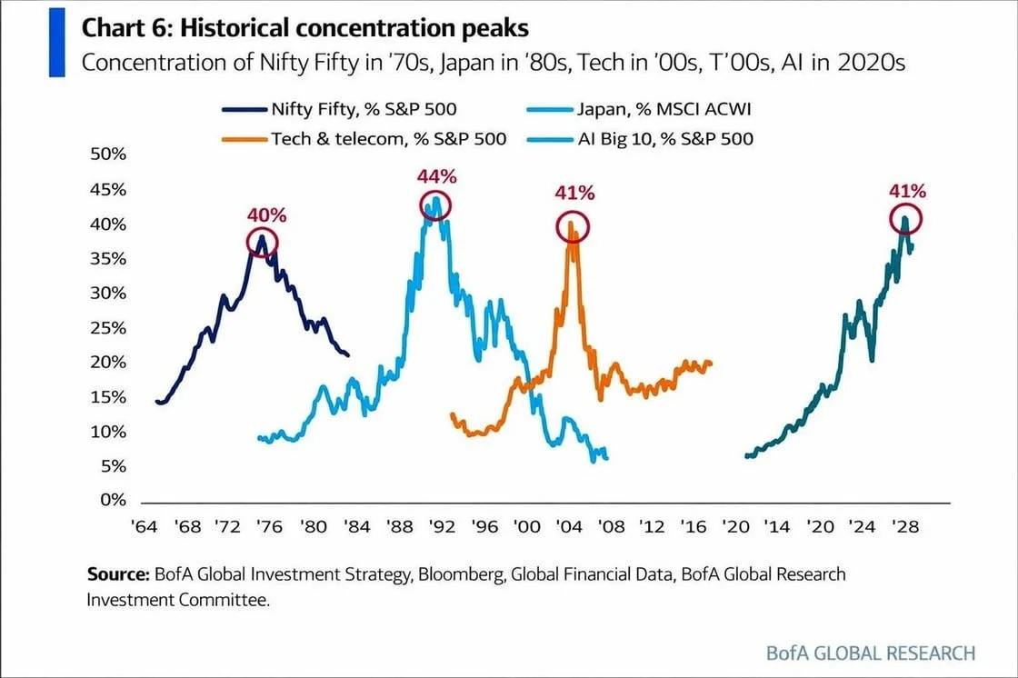 The top 10 companies now make up more than 40% of the S&P 500's total market value, the highest level of concentration since at least 1972. If you invested $1 million in the index today, about $400,000 would be allocated to just 10 companies, while the remaining $600,000 would be spread across the other 490.