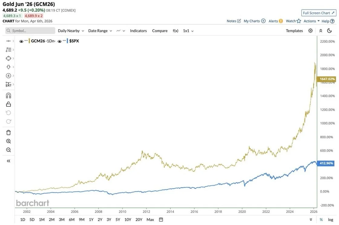 Gold accomplished this without requiring its holders to assess earnings models, evaluate management teams, or predict competitive outcomes. You held it. It preserved value. The standard rebuttal is that gold pays no dividends and does not compound through reinvestment. Fair enough. But gold's long-run outperformance from a dollar-denominated starting point reflects something real about the currency doing the measuring. When a hard asset wins across multiple decades against the broadest equity index in the world, the monetary system is sending a signal worth taking seriously.