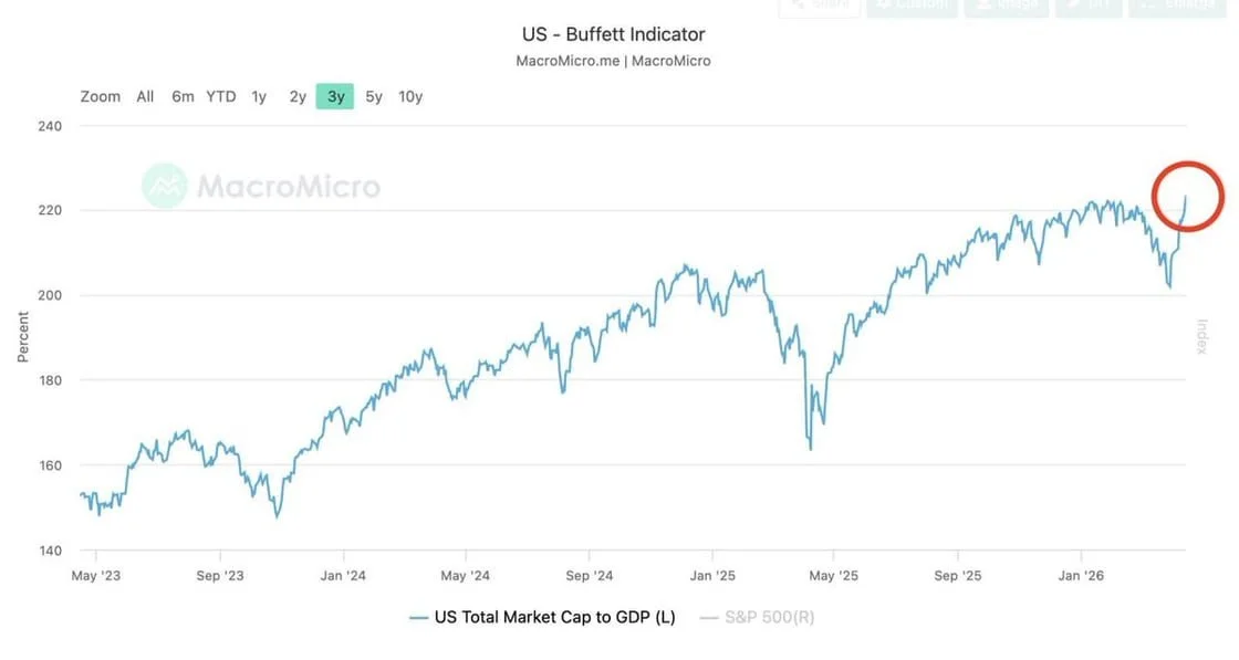The Buffett Indicator, which measures total market capitalization against GDP, just hit its highest level in history at 223.55%, surpassing even the dot-com peak. Berkshire Hathaway is holding nearly $400 billion in cash, much of it in Treasuries, and now owns more T-bills than the Federal Reserve. When the most celebrated long-term equity conglomerate in history is sitting on the largest cash pile ever assembled rather than deploying it into the market, that is worth pausing on.