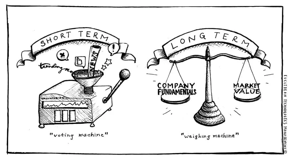 A useful reference point comes from traditional value investing. Warren Buffett, quoting Ben Graham, wrote: “In the short run, the market is a voting machine but in the long run it is a weighing machine.”